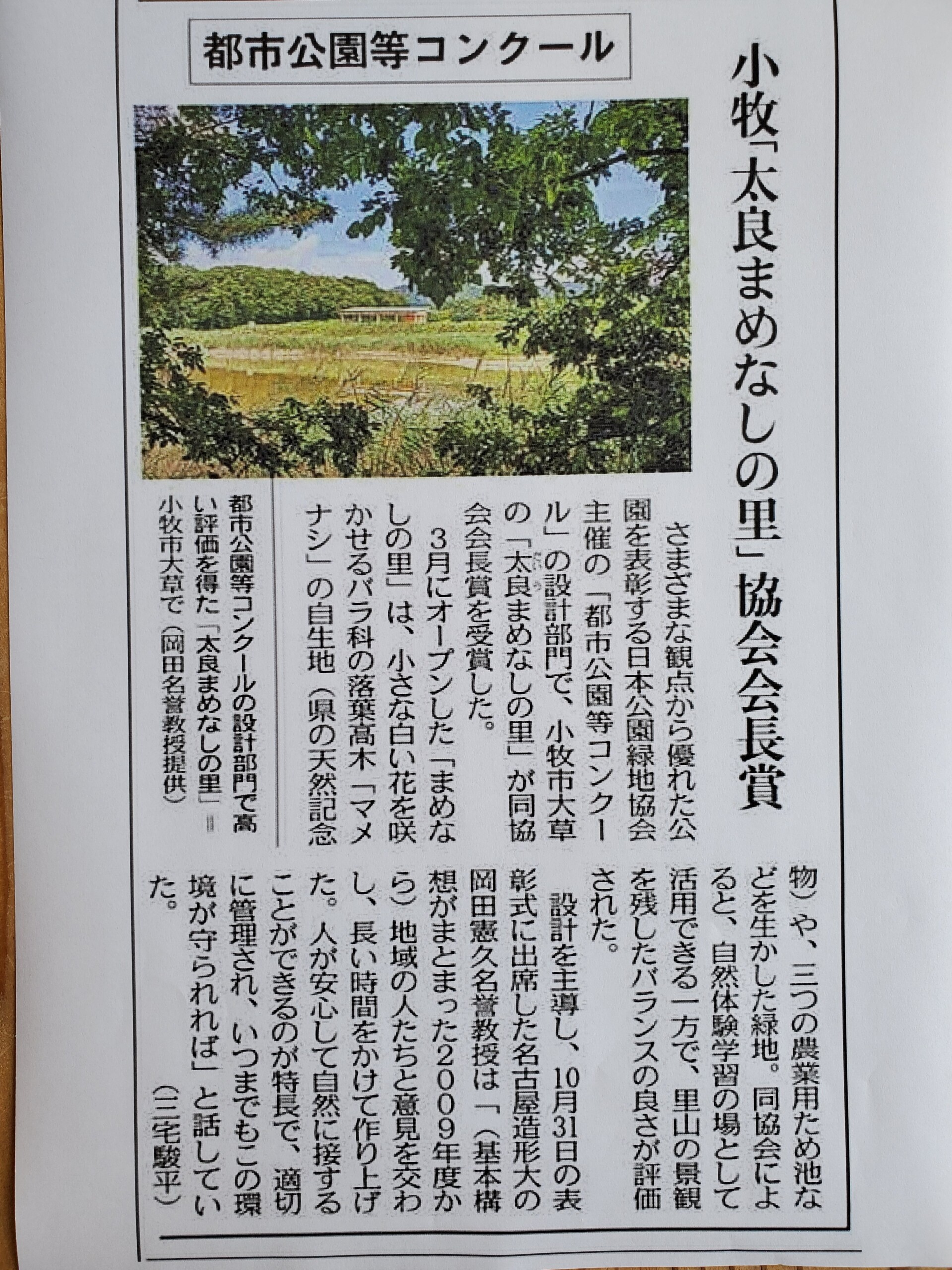 太良まめなしの里 都市公園等コンクール受賞 2025.11.12 ニュース Post Share Hatena 太良まめなしの里 都市公園等コンクール受賞されました 令和7年度 第41回都市公園等コンクール 設計部門にて 小牧市の「太良まめなしの里」が 一般社団法人日本公園緑地協会会長賞を受賞されました! 株式会社オオバ様、小牧市様、岡田先生 おめでとうございます! 中日新聞に丁寧に掲載されました。 緑とため池の景色全体を見渡せる「みはらし小屋」に 弊社の囲柱ラーメン木構造を採用していただきました。 愛知県天然記念物のバラ科落葉高木「マメナシ」の自生地である まめなしの里。 地域の方にもここで生活する生き物たちにも愛される豊かな自然が 未来永劫残ることを願っています。 Post Share Hatena Pocket RSS feedly Pin it ニュース, 新聞雑誌掲載 コメント: 0 住宅ジャーナル2025.6号に掲載されました 建築ジャーナル11月号に掲載されました 関連記事一覧 ニュース グランドフェア2021 2021.11.05 ニュース 新年ご挨拶2025 2025.01.06 新聞雑誌掲載 ウッドミック 2021年8月号(2021年8月10日発行)掲... 2021.08.17 ニュース 見学会Part2 2021.06.28 新聞雑誌掲載 2017年10月18日 鉄鋼新聞掲載 2017.10.18 展示会出展 「ウッドデザイン賞2019」展示会はじまる 2019.12.06 ニュース WOODコレクション2022 2022.01.19 新事務所 完成見学会 5/24・25 2019.05.28 コメント ( 0 ) トラックバックは利用できません。 この記事へのコメントはありません。