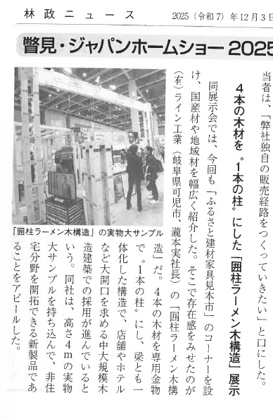 林政ニュースに掲載していただきました 2025.12.12 ニュース Post Share Hatena 林政ニュース2025.12.3に掲載していただきました 11月に開催されましたジャパンホームショー&ビルディングショー2025に出展した様子を 林政ニュースに掲載していただきました。 ありがとうございました。 多くの方に知っていただけたら嬉しいです。 Post Share Hatena Pocket RSS feedly Pin it ニュース, 新聞雑誌掲載 コメント: 0 建築ジャーナル11月号に掲載されました 木材の適正な取引ガイドライン 関連記事一覧 ニュース 太良まめなしの里 都市公園等コンクール受賞 2025.11.12 ニュース 商標登録されました 2020.07.07 新聞雑誌掲載 月刊住宅ジャーナル 2021年9月号(2021年8月15日発... 2021.08.31 ニュース 構造見学会in姫路 2025.04.03 ニュース 2024年4月1日 日刊木材新聞掲載 2024.04.03 工事の進捗 第1棟目 建築工事進捗④ 2018.09.03 ニュース 見学会in埼玉和光2024.3 2024.02.20 工事の進捗 第1棟目 建築工事進捗⑪ 2018.11.27 コメント ( 0 ) トラックバックは利用できません。 この記事へのコメントはありません。